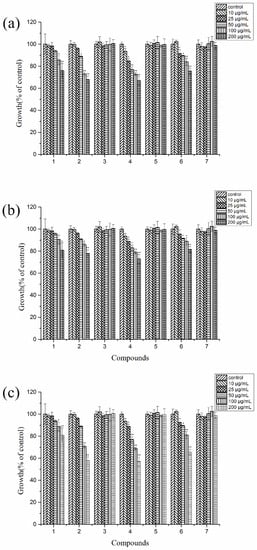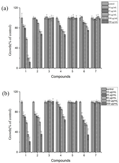 As shown in Figure 3, compounds 1, 2, 4, and 6 inhibited the growth of the seedlings of L. sativa, while compounds 3, 5, and 7 had no effect. The inhibitory effect increased with the increase in treated concentrations. Compound 1 displayed a strong inhibition on the growth of L. sativa at all treated concentrations. The inhibition ratios to the roots and stems of L. sativa at the concentration of 200 μg/mL were 78.87% and 87.87%, respectively. Compounds 2, 4, and 6 showed strong inhibition on the growth of L. sativa at higher concentrations (≥50 μg/mL), while there were slight or no effects at low treated concentrations. Meanwhile, the inhibition ratios on roots were more remarkable than that on stems for L. sativa seedlings. At the maximum concentration (200 μg/mL), the inhibition ratios of roots reached to 64.29%, 35.50%, and 65.53%, respectively.