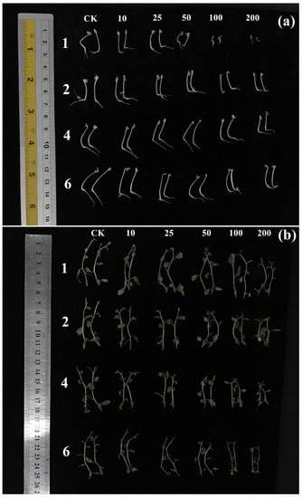 Typical pictures of the effects of compounds 1, 2, 4 and 6 on the growth of L. sativa seedlings (a) and potato tissue culture seedlings (b) at concentrations of 0, 10, 25, 50, 100, and 200 μg/mL.