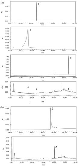 HPLC analysis of the allelochemicals in the rhizosphere soil of continuously cropped potato at 240 nm (a) and 320 nm (b), respectively; purified compounds 1, 4, and 6 were detected at 240 nm (a) and compound 2 was detected at 320 nm (b).