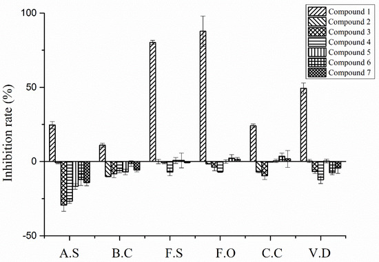 The effects of compounds 1–7 against the potato pathogens including A. solani, B. cinerea, F. solani, F. oxysporum, C. coccodes, and V. dahlia at a concentration of 200 μg/mL.