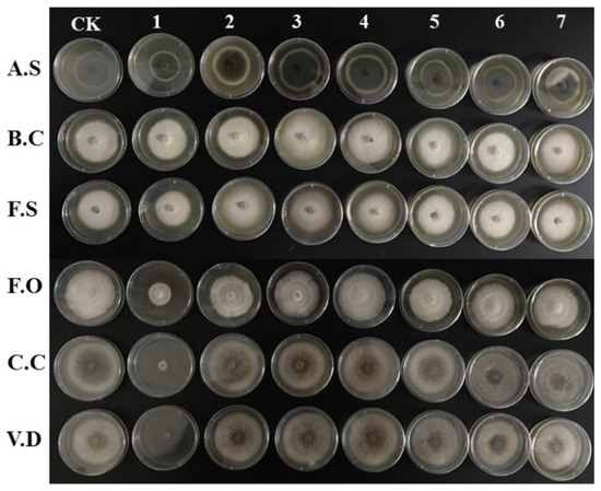 Typical pictures of the effects of compounds 1–7 against potato pathogens including A. solani, B. cinerea, F. solani, F. oxysporum, C. coccodes, and V. dahlia at a concentration of 200 μg/mL.