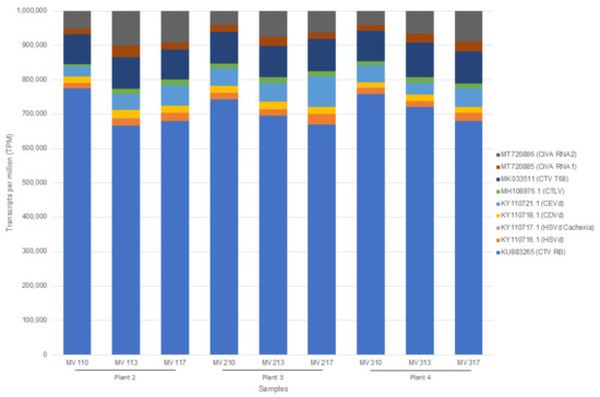 Stacked column chart displaying the transcripts per million (TPM) ratio for each pathogen reference analyzed. The ratios of the TPM count of each pathogen relative to the TPM count of the other pathogens are displayed for each sample subjected to the CTAB/Illumina HTS protocol (CTV: citrus tristeza virus; CiVA: citrus virus A; CTLV: citrus tatter leaf virus; HSVd: hop stunt viroid; CDVd: citrus dwarfing viroid; CEVd: citrus exocortis viroid). MV110, MV113, and MV117 represent RNA extraction technical replicates from infected plant 2 (C. sinensis cv. ‘Madam Vinous’, sweet orange), MV210, MV213 and MV217 represents RNA extraction technical replicates from infected plant 3 (C. sinensis cv. ‘Madam Vinous’, sweet orange) and MV310, MV313, and MV317 represent RNA extraction technical replicates from infected plant 4 (C. sinensis cv. ‘Madam Vinous’, sweet orange).