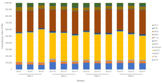 Stacked column chart displaying the transcripts per million (TPM) values for each reference gene analyzed. The ratios of the TPM count of each gene relative to the TPM count of the other genes are displayed for each sample subjected to the CTAB/Illumina HTS protocol (SAND: SAND family protein; DIM1: DIM1 homolog/YLS8; Unknown protein: Citrus sinensis carnosine N-methyltransferase-like transcript; FBOX: F-box family protein; UPL7: Ubiquitin-protein ligase 7; UBC21: Ubiquitin-conjugating enzyme 21; PTB1: Polypyrimidine tract-binding protein 1; GAPC2: Glyceraldehyde-3-phosphate dehydrogenase C2; UBC9: Ubiquitin conjugating enzyme 9; ACT2: Actin-2; EF-1a: Elongation factor 1-alpha; TUB: beta-Tubulin). MVH1, MVH2, and MVH3 represent RNA extraction technical replicates from healthy plant 1 (C. sinensis cv. ‘Madam Vinous’, sweet orange), MV110, MV113, and MV117 represent RNA extraction technical replicates from infected plant 2 (C. sinensis cv. ‘Madam Vinous’, sweet orange), MV210, MV213, and MV217 represent RNA extraction technical replicates from infected plant 3 (C. sinensis cv. ‘Madam Vinous’, sweet orange), and MV310, MV313, and MV317 represent RNA extraction technical replicates from infected plant 4 (C. sinensis cv. ‘Madam Vinous’, sweet orange).