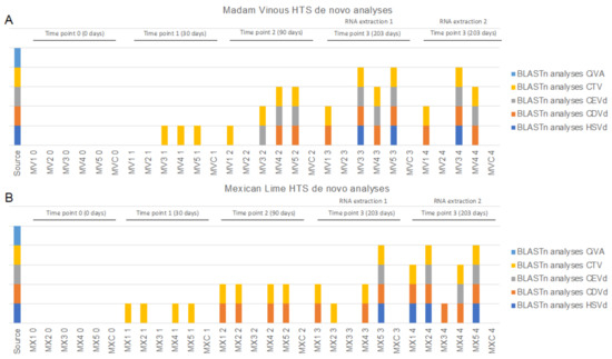 On average 23 million paired-end reads were received per sample from the Illumina HTS and after stringent quality trimming 96% of the data per sample was retained (Supplementary File S3). The data were de novo assembled using SPAdes into an average of 60,284 scaffolds with an average N50 of 1812 nt (Supplementary File S3). Based on the BLASTn analysis of the scaffolds, read mapping and RT-PCRs, no virus or viroid sequences were identified in the uninoculated samples at each time point or in any of the inoculated samples at time point 0 (Supplementary File S3, Figure 3). At time point 1 (30 days post inoculation) only CTV was detected with de novo assembly/BLASTn analyses (Figure 3). The RT-PCR assays produced the same results for the Madam Vinous’ plants at time point 1. With read mapping, CEVd was additionally detected in two ‘Madam Vinous’ samples at time point 1 (Figure 4B). In both the ‘Mexican Lime’ and ‘Madam Vinous’ plants, there was one sample (MV2 and MX3) that remained negative for all tested pathogens with both the de novo assembly/BLAST and read mapping pipelines and with RT-PCR, except when the RNA was extracted using the second RNA extraction protocol with acidic phenol phase separations and precipitation with ethanol at 203 days post inoculation (Figure 4). In all samples, the same number or more pathogens were detected with HTS compared to RT-PCR, except for four samples where the inverse was observed (Figure 4). In the healthy control ‘Madam Vinous’ sample of the 30 days post inoculation time point (MVC 1) and the healthy control ‘Mexican Lime’ sample of the 90 days post inoculation time point (MVC 2) CTV was detected via RT-PCR with a faint amplicon (Figure 4A); however, RNA extraction or PCR contamination is the most probable explanation, since these seedlings were grown from seed in an insect-free greenhouse and tested negative in subsequent assays. Two ‘Mexican Lime’ plants, MX5 (time point 1) and MX1 (time point 3, RNA extraction 1), additionally tested positive with only RT-PCR for CDVd and CEVd, respectively (Figure 4C and Figure 4D). No plants tested positive for CLaf or CiVA at time point 4 (203 days post inoculation). The HTS library construction for MV5 (time point 3, RNA extraction 2) was not successful and no sequencing data was obtained for this sample.