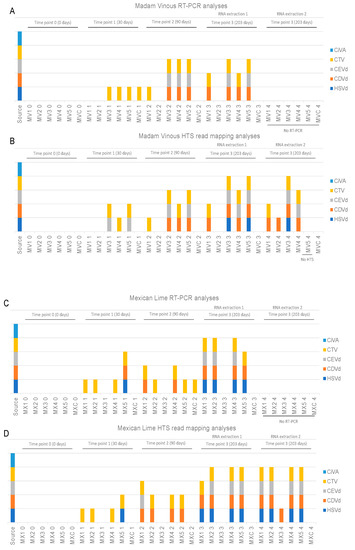 Stacked column chart displaying the virome profile of Madam Vinous (A,B) and Mexican Lime (C,D) plants at different time points constructed with RT-PCR (A,C) and HTS read mapping analyses (B,D). Each column represents a plant (MV1–5 or MX1–5) from which RNA was extracted 5 times (0–4). Extractions 3 and 4 were extracted both on 203 days post inoculation, but with different RNA extraction methods (RNA extraction 1: CTAB with LiCl precipitation; RNA extraction 2: CTAB extraction with ethanol precipitation). Samples MVC and MXC represent the healthy controls. Sample MV5 (extraction 4) was not evaluated with HTS. Samples MV1–5 (extraction 4) and samples MX1–5 (extraction 4) were not evaluated with RT-PCR (CTV: citrus tristeza virus; CiVA: citrus virus A; HSVd: hop stunt viroid; CDVd: citrus dwarfing viroid; CEVd: citrus exocortis viroid).