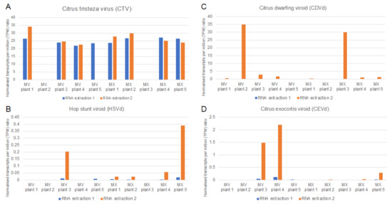 Clustered column chart displaying the relative pathogen concentration (normalized transcripts per million (TPM) ratio) at time point 3 (203 days post inoculation) for citrus tristeza virus (CTV) (A), Hop stunt viroid (HSVd) (B), citrus dwarfing viroid (CDVd) (C) and citrus exocortis viroid (CEVd) (D) obtained from RNA extracted with two different RNA extraction methods (RNA extraction 1: CTAB with LiCl precipitation; RNA extraction 2: CTAB extraction with ethanol precipitation) from five plants per cultivar (MX: ‘Mexican Lime’; MV: ‘Madam Vinous’).
