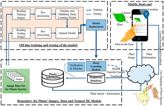 The overall flow of the proposed system is presented in Figure 1. The system is composed of three main components: (1) a computer vision and deep-learning-based plant species classifier, (2) a knowledge base as a central repository for plant information together with auxiliary and feedback data, and (3) a mobile front-end that provides a user interface to the end-user to interact with the system and displaying of classification results. Details for each component of the system are explained in the subsequent subsections.