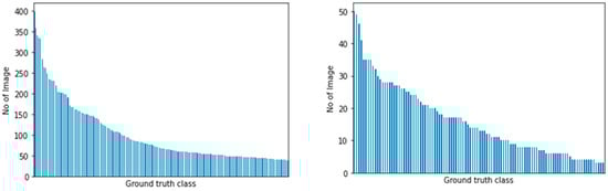 Class distribution for PlantCLEF 2015 (left) and UBD Botanical dataset (right). Ground truth class names were removed from the x-axis for brevity.