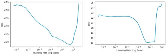 Following the super convergence approach for neural networks, the learning rate range test (LR range test) was performed to find the optimal LRmin and LRmax to be used in the Cyclical Learning Rate (CLR) [31,32]. The losses for each mini-batch were plotted with respect to the LR range of 10−10 < LR < 1, increasing exponentially on each mini-batch. The LR range test serves as a guide for how well a network performs through a range of learning rates and spot values that effectively train the network. The stopping criteria for the LR range test was set at a condition when the current loss is 4 times greater than the previous loss, as seen in Figure 4 at LR > 102 regime for the PlantCLEF 2015 dataset. The “triangular” learning rate policy rule was opted for this study where learning rates oscillate in a triangular cycle from LRmin to LRmax in equal lengths of steps size. We set the LRmin and LRmax to be 10−2 to 10−1 and 10−4 to 10−2 for the PlantCLEF 2015 and UBD Botanical datasets, respectively.
