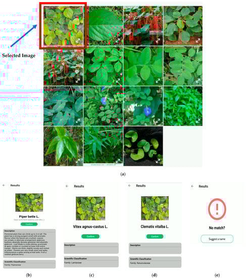 Examples of offline classification of a plant by using the mobile application and feedback option for correction/suggestion for the plant name. (a) Images from the gallery for offline testing: (b) first matching, (c) second matching, (d) third matching, and (e) feedback option.