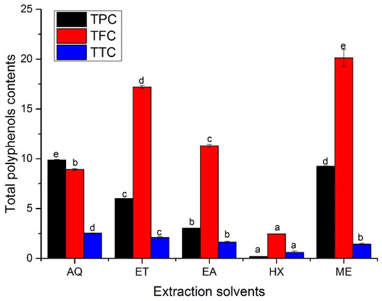 There was comparably higher significant variation (p < 0.05) in the total phenols (TPC), flavonoids (TFC), and tannin contents (TTC) in the various leaf extracts of A. hendersonii, as depicted in Figure 1. Total phenolic content was highest in the water extract (9.86 ± 0.05 mg GAE/g DW), followed by methanol leaf extract, which had phenolic content of 9.25 ± 0.03 mg GAE/g DW and ethanol extracts (6.00 ± 0.04 mg GAE/g DW). The lowest total phenolic content (0.19 ± 0.009 mg GAE/g DW) was obtained in n-hexane leaf extracts, which may not be unconnected to its non-polarity. The higher phenolic content obtained in water extract may have been attributed to higher sugar levels reacting with the Folin–Ciocalteu regent, leading to its overestimation [28], or due to the formation of some complex phenolic compound soluble in methanol or ethanol or from the presence of non-phenolic compounds such as carbohydrate or terpene in the aqueous extract [23]. It might also be due to the higher polarity of the water and comparably higher solubility of the phenols in water from its numerous hydroxyl group [5]. Methanol and ethanol or their aqueous forms are the most common solvents employed in the extraction of plant-based metabolites, and the choice of solvents has a significant role in yield and bioactive properties [23,24,25]. The methanol extract was reported to have had the highest phenolic contents in Cupressus sempervirens [29], Ceropegia spp. [30], and pomegranate peels [31], as obtained in this study.