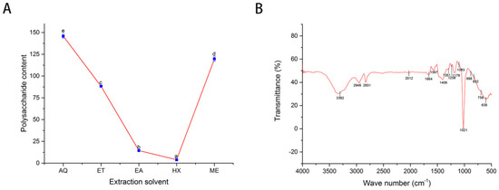 Polysaccharide contents (mg GE/g DW) of the various solvents (A) and FT-IR spectroscopy analysis of methanol extracts, showing characteristics peaks corresponding to the functional group of the constituents (B). GE: Glucose equivalent; AQ: Water; ET: Ethanol; EA: Ethyl acetate, HX: n-Hexane; ME: Methanol. The different letters in A indicate statistical differences (p < 0.05).