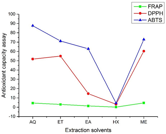Antioxidant capacity assays of the A. hendersonii leaf extracts obtained using various solvents. FRAP: Ferric Reducing Antioxidant Potential (µmol Fe2+ per g DW); DPPH: 2,2-Diphenyl-1-picrylhydrazyl (%); ABTS: 2,2′-azino-bis (3-ethylbenzothiazoline-6-sulfonic acid (%); AQ: Water; ET: Ethanol; EA: Ethylacetate, HX: n-Hexane; ME: Methanol.