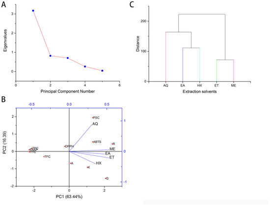 Principal component analysis and hierarchical cluster analysis of the various extracts, constituents, and bioactivities. (A) Eigenvalues of the variances. (B). Contribution of bioactive constituents to the principal components 1 and 2. (C). Dendogram of cluster analysis. FRAP: Ferric Reducing Antioxidant Potential; DPPH: 2,2-Diphenyl-1-picrylhydrazyl; ABTS: 2,2′-azino-bis (3-ethylbenzothiazoline-6-sulfonic acid (%); AQ: Water; ET: Ethanol; EA: Ethyl acetate, HX: n-Hexane; ME: Methanol; A: apigenin; R: rutin; Q: quercetin; K: kaempferol.