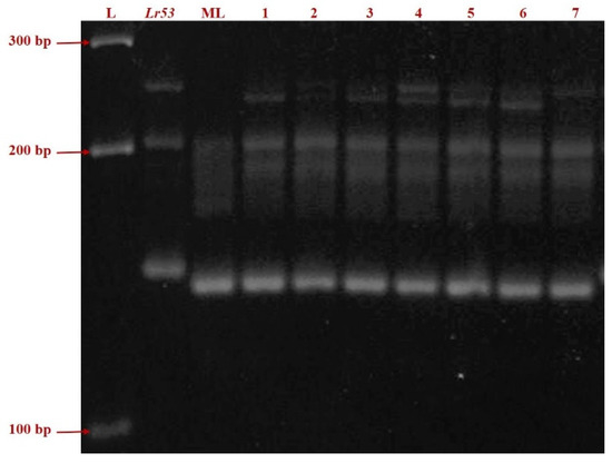 PCR amplification of the SSR marker gwm508 in Lr53 genetic stock, negative control ML and seven germplasm lines (Left to Right: L = ladder; Thatcher + Lr53 = positive control; ML = Mandsaur Local = negative control; 1. IC138898; 2. IC47022; 3. IC535116; 4. IC535133; 5. IC535139; 6. IC 551396; 7. IC534144).