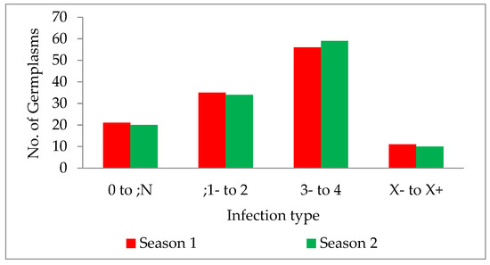 Bar graph description of germplasm infection types in two seasons, 2019–2020 and 2020–2021.