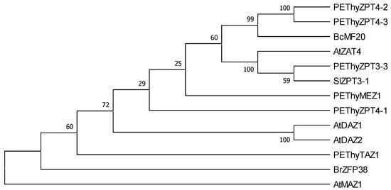 Molecular phylogenetic tree of AtZAT4 with other C2H2-Zinc Finger Proteins (C2H2-ZFPs). The tree was obtained from the multiple alignments of the deduced AtZAT4 and other C2H2-ZFPs following the Neighbor-Joining method in the MEGA-X package with 1000 replicates for bootstrap values. For details, see Section 4.
