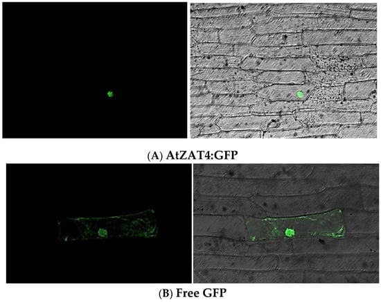 First, in silico prediction of a Nuclear Localization Signal (NLS) was performed by NLStradamus online software (http://www.moseslab.csb.utoronto.ca/NLStradamus/ accessed on 21 April 2015) []. Subsequently, the cDNA of AtZAT4 was cloned in pGEM®-T Vector Easy (Promega, Madison, WI, USA) without stop-codon and with a cleavage site for NcoI at its 3′ end. The resulting plasmid was treated with NcoI enzyme and the released fragment was ligated into the pGFPau vector, containing GFP, under the control of the Cauliflower Mosaic Virus (CaMV) 35S promoter. The constructs were transferred into onion epidermal cells by particle bombardment using a Bio-Rad Biolistic PDS 1000/He system. The samples were incubated for 24 h at 22 °C in darkness. The protein localization was determined by a Leica SP2 confocal microscope (Leica, Wetzlar, Germany).