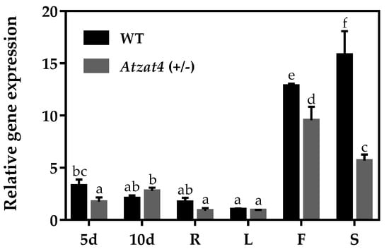Gene expression profile of Atzat4 (+/−) in vegetative and reproductive tissues of Arabidopsis thaliana and in 5- and 10-day-old seedlings. 5d Five-day-old seedlings, 10d Ten-day-old seedlings, R root, L leaf, F flower, S silique. Values represent mean ± SE (n = 3). The constitutive expression of the gene AtF-box [] and the 2−ΔΔCt method described by Livak and Schmittgen (2001) [] were used for normalization. The transcript levels obtained for R were taken to assign the value one. Data correspond to the mean ± SE. Significant differences (p ≤ 0.05) are shown with different letters. For details, see Section 4.