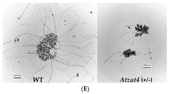 Male germline in Atzat4 (+/−) compared to WT in Arabidopsis thaliana. (A,B) Modified Alexander stain []. (A) Non-aborted pollen grain quantification. (B). Alexander red staining of pollen grains by anther, non-aborted pollen grains are stained red. (C–E) In vitro pollen grain germination and pollen tube elongation. (C) Quantification of germinated pollen grains (n = 300 pollen grains analyzed). (D) Pollen tube elongation quantification (n = 300 pollen grains germinated). (E) In vitro pollen grain germination and pollen tube elongation under the light microscope. In (A,C,D) data correspond to the mean ± SE; **** p < 0.0001, *** p < 0.001, ns: not significant. In (B,E), bars = 100 µm. For details, see Section 4.