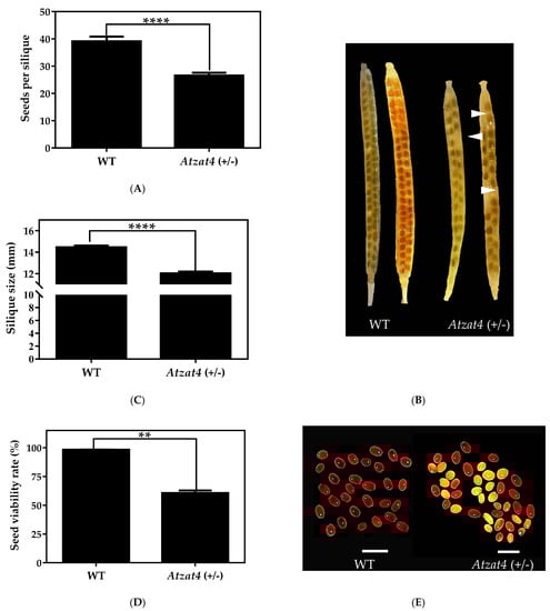 Discoloration of mature, non-dehiscent silique was performed for WT and Atzat4 (+/−); The seeds quantification was performed under the Olympus SZ30 magnifying glass (Tokyo, Japan). Seeds of 10 siliques from three different plants were quantified. Furthermore, the sizes of 12 mature non-dehiscent siliques from three different plants were quantified for the two genotypes.
