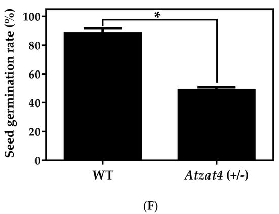 Fertility in Atzat4 (+/−) compared to WT in Arabidopsis thaliana. (A) Seeds per silique quantification (n = 10 siliques in triplicate). (B) Discolored siliques with developed seeds and unfertilized ovules (white arrowheads). (C) Silique size quantification (n = 10 siliques in triplicate). (D) Viable seeds quantification using Tetrazolium test (n = 100 seeds in triplicate). (E) Tetrazolium test, red staining shows viable seeds, unstained unviable seeds and pink stain indicates dead tissue. (F) Quantification of germinated seeds (n = 100 seeds in triplicate). In (A,C,D,F) data correspond to the mean ± SE; **** p < 0.0001, ** p < 0.01, * p < 0.05. In (B,E), bars = 1 mm. For details, see Section 4.