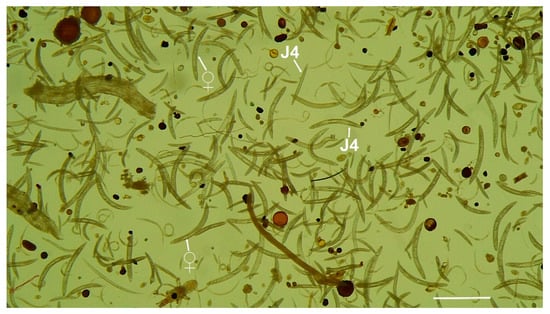 Soil sample extraction (500 cm3) from peach in Calasparra, Murcia, Spain showing numerous female and juveniles (arrowed) of Criconema paraannuliferum sp. nov. “♀” = female, and “J4” = fourth-stage juvenile. (Scale bar = 500 µm).