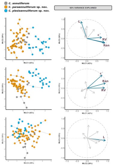 In the maximum likelihood factor analysis (FA), the first three components (sum of squares (SS) loadings > 1) accounted for 65% of the total variance in the morphometric characteristics of the C. annuliferum-complex (Table 2). The eigenvalues for each character were used to interpret the biological meaning of the factors. First, the maximum likelihood component 1 (MLC1) was dominated by number of annuli between the posterior end of the body and the vulva (RV), number of annuli on the tail (Ran) and for the c’ ratio with high positive correlations (eigenvalues = 0.86, 0.90 and 0.73, respectively). This component was, therefore, related with the shape and size of the posterior part of nematode and tail. The ML2 was dominated by a high positive correlation for the nematode body length (L) (eigenvalue = 0.89), thereby relating this component to the overall nematode size. Finally, the ML3 was dominated by a high positive correlation for the c’ ratio (eigenvalue = 0.67). This component was then related with tail shape. Overall, these results suggest that all the extracted components were related to the overall size and shape of nematodes in each population, especially the size and shape of the posterior part of the nematode. The results of the factor analyses were represented graphically in Cartesian plots where specimens from populations of the C. annuliferum-complex were projected on the plane of the x- and y-axes, respectively, as pairwise combinations of components 1 to 3 (Figure 2). The specimens of the C. annuliferum-complex of all species were projected in the graphic representation showing an expanded distribution along the plane for all the projected combinations of the components owing to their wide morphometric variation within species and/or populations. This was more pronounced for C. paraannuliferum sp. nov. and C. annuliferum, where a high number of populations were considered [16,19,27,39,40]. Consequently, we did not detect a clear separation among C. paraannuliferum sp. nov. and C. annuliferum, with all the specimens belonging to these species being projected at random for all the projected combinations. However, and except for the projection on the plane of MLC2 and MLC3, where specimens of all species were randomly plotted, we observed that most specimens belonging to C. plesioannuliferum sp. nov. were spatially separated from the rest of species within the C. annuliferum-complex (Figure 2). This spatial distribution was dominated by MLC1 accounting for 27% of the total of variance (42% of the proportion explained). This spatial separation was mainly dominated by MLC1 grouped species according to the number of annuli between posterior end of body and vulva (RV), number of annuli on tail (Ran) and for the c’ ratio (Table 2, Figure 2). Thus, specimens of C. plesioannuliferum sp. nov. having a higher number of annuli between the posterior end of the body and the vulva (RV), higher number of annuli on the tail (Ran) and higher values for the c’ ratio were located at the right side, and on the opposite side were C. paraannuliferum sp. nov., while those of C. annuliferum were characterized by lower values for these diagnostic characters (Figure 2) [16,27,39,40]. However, specimens of C. paraannuliferum sp. nov. and C. annuliferum having similar values for RV, Ran and the c’ ratio were grouped among them, not showing spatial separation between the species (Figure 2). A minimum spanning tree (MST) superimposed on the plot of the first three principal components showed the same patterns observed with factor analysis. That is, a separation of C. plesioannuliferum sp. nov. but no clear separation between C. paraannuliferum sp. nov. and C. annuliferum within the C. annuliferum-complex (Figure 2).