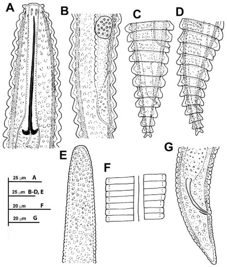 Line drawings of Criconema paraannuliferum sp. nov. (A), female anterior region; (B), detail of spermatheca; (C,D), female posterior region; (E), male anterior region showing absence of stylet; (F), male lateral field at mid-body; (G), male posterior region.