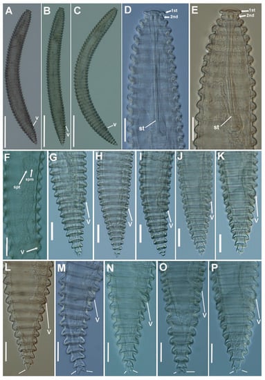 Light micrographs of Criconema paraannuliferum sp. nov. females. (A–C), whole female; (D,E), anterior region, 1st and 2nd body annuli (arrowed); (F), posterior region showing spermatheca filled with sperm (arrowed); (G–P), posterior region showing vulva (arrowed). Abbreviations: spt = spermatheca, spm = sperm; st = stylet; V = vulva; 1st, 2nd = first- and second-body annuli. Scale bars: 20 µm.