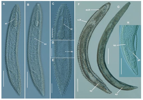 Light micrographs of Criconema paraannuliferum sp. nov. fourth-stage juveniles (J4) and males. (A,B), whole fourth-stage juvenile, showing stylet and rows of scales (arrowed); (C), J4 anterior region. (D), J4 mid-body portion showing rows of scales (arrowed); (E), J4 posterior region; (F), whole male enveloped by J4 cuticle. (G), whole male. (H), male tail showing spicules and gubernaculum (arrowed). Abbreviations: cJ4 = cuticle J4; gb = gubernaculum; sc = scales; sp = spicules; st = stylet; stJ4 = stylet of J4. Scale bars: (A,B) = 50 µm; (C–E,H) = 20 µm; (F,G) = 100 µm.