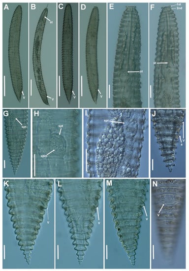 Light micrographs of Criconema plesioannuliferum sp. nov. females. (A–D), whole females (stylet and vulva arrowed); (E,F), anterior region, 1st and 2nd body annuli (arrowed); (G), posterior region with spermatheca (arrowed); (H,I), detail of spermatheca and sperm (arrowed); (J–N), posterior region showing vulva and anus (arrowed). Abbreviations: a = anus; spm = sperm; spt = spermatheca; st = stylet; V = vulva; 1st, 2nd = first- and second-body annuli. Scale bars: (A–D) = 100 µm; (E–N) = 20 µm.