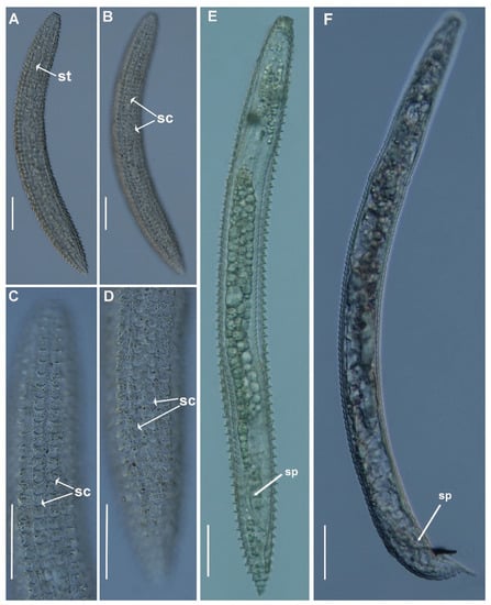 Light micrographs of Criconema plesioannuliferum sp. nov. juveniles and male. (A,B), whole juvenile, showing stylet and rows of scales (arrowed); (C), anterior region, showing rows of scales (arrowed); (D), posterior region showing rows of scales (arrowed); (E), whole male included in fourth-stage cuticle, showing spicules (arrowed); (F), whole male showing spicules (arrowed). Abbreviations: sc = scales; sp = spicules; st = stylet. Scale bars: (A–D) = 50 µm, (E,F) = 30 µm.