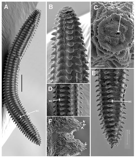 SEM micrographs of Criconema plesioannuliferum sp. nov. juveniles. (A), whole juvenile showing files of scales; (B), anterior region; (C), in face view; (D), mid-body region; (E), posterior region showing files of scales (arrowed); (F), detail of scales showing minute acute projections (arrowed). Abbreviations: oa = oral aperture; sc = scales. Scale bars: (A) = 25 µm; (B) = 5 µm; (C,D) = 2 µm; (E) = 10 µm; (F) = 1 µm.