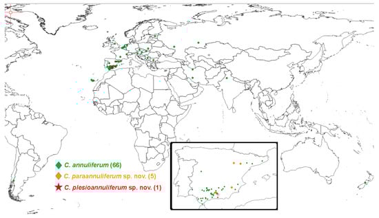 In an exhaustive review of the geographical distribution of the Criconema annuliferum -complex in cultivated and natural environments in Spain and all over the world, we detected that this species complex has a wide distribution across a wide variety of herbaceous and woody hosts (Figure 12). The Criconema annuliferum-complex is widely distributed in several European countries, but also in Africa [24], Asia [2,25], New Zealand [26], and South America [27]. It should be noted that the highest diversity seems to be in Spain, with three species in cultivated and wild environments (Figure 12). Although these data suggest that other species in this species complex may be found in other countries after accurate integrative taxonomical identifications are conducted on them.