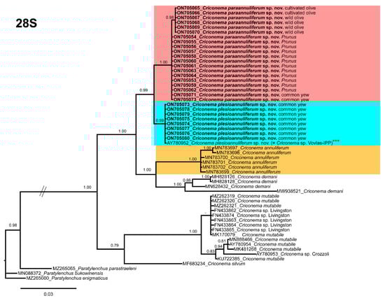 Phylogenetic relationships within the genus Criconema. Bayesian 50% majority rule consensus tree as inferred from D2-D3 expansion domains of the 28S rRNA sequence alignment under the general time-reversible model of sequence evolution with a gamma-shaped distribution (GTR + G). Posterior probabilities of more than 0.70 are given for appropriate clades. Newly obtained sequences in this study are in bold. The scale bar indicates expected changes per site, and the coloured boxes indicate the clade association of the Criconema annuliferum-complex. *** Initially identified in NCBI as Criconema sp. Vovlas-Italy.