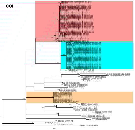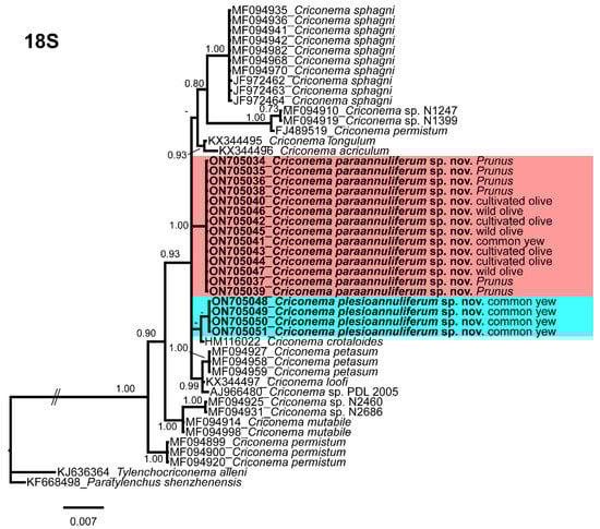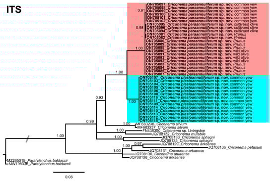 The ITS rRNA gene alignment (739 bp long) included 49 sequences of eight species of Criconema and two outgroup sequences of Paratylenchus baldaccii (MW798336, MZ265015). Thirty-six new sequences were included in this analysis. The Bayesian 50% majority rule consensus tree inferred from the ITS alignment is given in Figure 14. The tree showed a well-supported subclade (PP = 1.00) with Criconema paraannuliferum sp. nov. (ON705081–ON705102) and Criconema plesioannuliferum sp. nov. (ON705103–ON705116), but clearly separated from each other.
