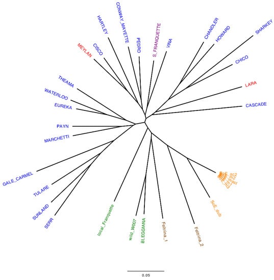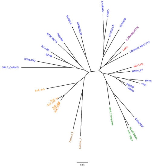 Unrooted neighbor-joining tree produced from Bruvo’s distance matrix estimated from SSR data. Labels are colored according to the geographical origin: green = northeastern Italy—Trentino; brown = northeastern Italy—Veneto; orange = south Italy—Campania; red = France; blue = USA; violet = France/USA.