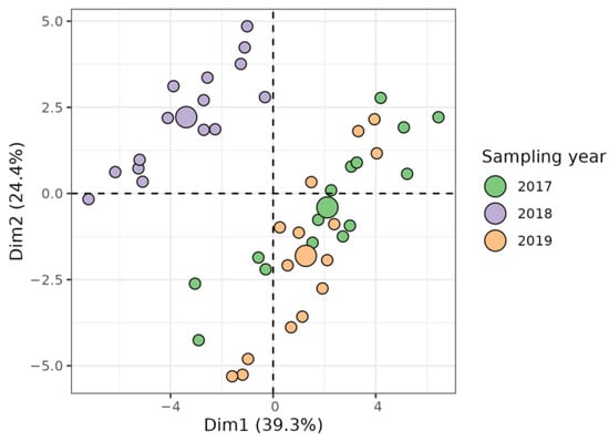 Principal component analysis (PCA) of three walnut cultivars (‘Bleggiana’, ‘Blegette’ and ‘Lara’) of three harvesting seasons, based on polyphenol composition, obtained from LC–MS/MS. The score plot shows the first two PCs, which account for 63.7% of the total variance, and a clear separation between the samples harvested in 2018 and the ones collected in 2019 and 2017. Large circles show the centroid of each sampling year cluster.