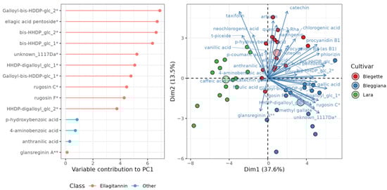 Principal component analysis (PCA) of three walnut cultivars (‘Bleggiana’, ‘Blegette’ and ‘Lara’) based on 35 polyphenolic constituents after removal of the year effect. The score plot (on the right) shows the first two PCs, which account for 50% of the total variance, and a clear separation between the three cultivars; large circles show the centroid of each cultivar cluster. The contribution of the 14 compounds that mainly discriminate among cultivars along PC1 is shown in the variable importance plot on the left; these compounds largely represent the class of ellagitannins (highlighted in red). * quantified as ellagic acid; ** quantified as gallic acid.