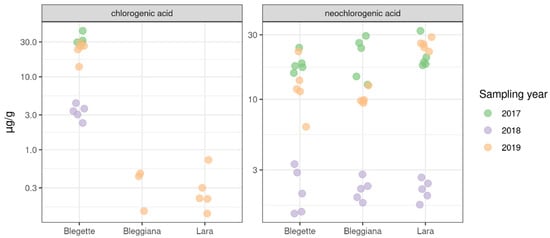 Dot plot of chlorogenic and neochlorogenic acid concentration in the samples of three walnut cultivars (‘Bleggiana’, ‘Blegette’ and ‘Lara’) collected in three different harvesting seasons (2017, 2018, 2019). Quantification was obtained by ultraperformance liquid chromatography coupled with tandem mass spectrometry (UPLC-MS/MS) in the whole raw kernel. Chlorogenic acid seems to be absent in cultivars ‘Bleggiana’ and ‘Blegette’, being undetected in 2017 and 2018, and just very close to the detection limit in 2019. Conversely, the concentration levels of neochlorogenic acid are similar in all the three cultivars and consistent across the harvesting seasons.