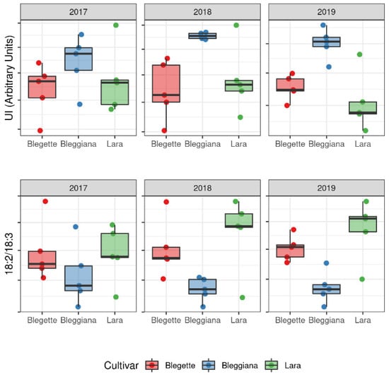 Boxplot for the unsaturation index (UI) value and ω-6/ω-3 ratio determined in three harvesting seasons (2017, 2018 and 2019) for three walnut cultivars (‘Bleggiana’, ‘Blegette’ and ‘Lara’).