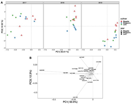 Principal component analysis (PCA) (A) and loading plot (B) of the VOC profiles, assessed by PTR-ToF-MS, of the walnut accessions ‘Bleggiana’, ‘Blegette’ and ‘Lara’ of three harvesting seasons (2017, 2018 and 2019). Each point of the PCA plot is the average of three technical replicates.