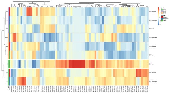 Heat map and two-dimensional hierarchical dendrograms of the VOC profile, assessed by PTR-ToF-MS, of the walnut accessions ‘Bleggiana’, ‘Blegette’ and ‘Lara’, of three harvesting seasons (2017, 2018 and 2019). Cluster analysis was performed using Ward’s method on centered and scaled data. Walnut samples are grouped and clustered by rows, while VOC compounds are organized by columns.