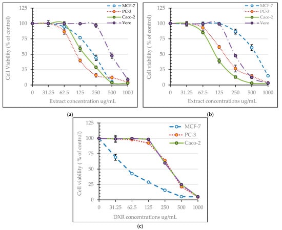 MTT assay results of viability/cytotoxicity on MCF-7, PC-3, Caco-2, and Vero cells: (a) effect of the methanolic extracts from neem fruit mesocarp; (b) effect of the methanolic extracts from neem fruit epicarp; (c) effect of doxorubicin. Cytotoxicity levels were derived from three experiments done in triplicate. Values are represented as the mean ± SD.