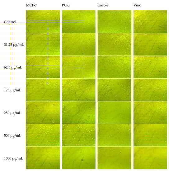 Morphology of MCF-7, PC-3, Caco-2, and Vero cells after 48 h from the treatment with different concentrations of the methanolic extract of neem fruit mesocarp.
