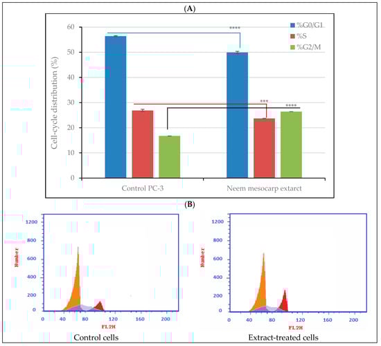 Cell-cycle distribution of PC-3 cells treated with methanolic fruit mesocarp extracts of neem at 111 µg/mL: (A) quantitative cell-cycle distribution % illustrated by the bar graph with cell growth arrest@ G2/M; (B) flow cytometry histogram showing DNA content of neem extract-treated cells. Significance differences between treated and control cells were determined using unpaired t-test, *** p < 0.001, and **** p < 0.0001. The data presented are the means of three replicates; ±SD indicated by the vertical bars.
