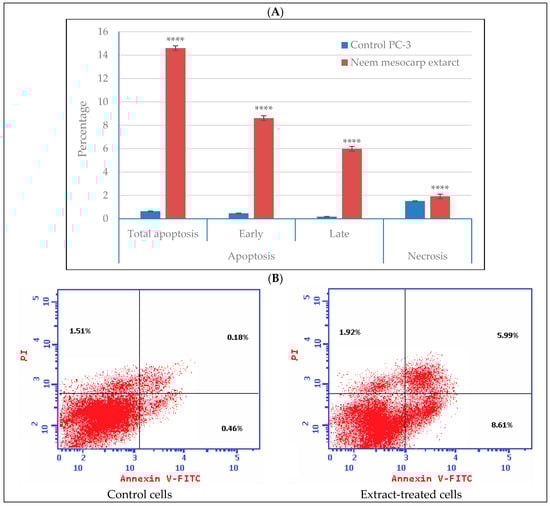 The incidence of apoptosis and necrosis in the tested cancer cells was evaluated using an Apoptosis Detection Kit, FITC Annexin V with PI (BioVision, Milpitas, CA, USA). In accordance with the manufacturer’s instructions, the PC-3 cells were incubated in 6-well culture plates (4 × 105 cells/well) for 24 h, and then treated with the methanolic extract of neem fruit mesocarp (111 µg/ mL) for the period of 24 h. After that, cells were collected and washed twice with PBS, and then resuspended in Annexin V-binding buffer (100 µL). Afterward, Annexin V-FITC and propidium iodide dyes at the rate of 5 μL each were mixed with the cells and incubated for 15 min under dark conditions. The flow cytometry (BD FACSCalibur) was used to assess the apoptotic vs. necrotic cell populations.