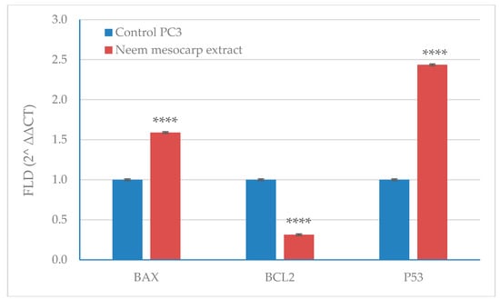 qRT-PCR quantification of apoptosis-related genes expression (BAX, BCL2, and P53) in PC-3 cells treated with the methanolic extract of neem fruit mesocarp at 111 µg/mL, compared with untreated cells. Significance differences between treated and control cells were determined using unpaired t-test, **** p < 0.0001. The data presented are the means of three replicates; ±SD indicated by the vertical bars.