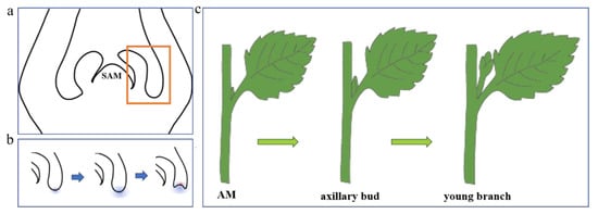 Shoot branching is a common phenomenon in plant growth and plays a very important role in plant morphogenesis. Branching also affects plant competitiveness against weeds or pests [2,3]. Therefore, research on branching mechanisms has become a popular topic worldwide. Studies have shown that axillary meristems initiate from cell groups detached from the primary SAM that retain their meristematic identity (Figure 1). Alternatively, axillary meristems may originate de novo later in development from partially or fully differentiated cells. Development of the lateral branch involves two important processes, axillary meristem formation and axillary bud growth [4,5].